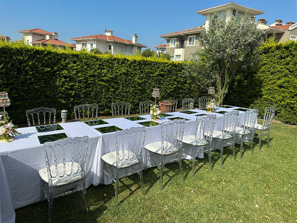 Kemerburgaz bölgesinde kır düğünleri ve bahçe organizasyonları için şeffaf Napolyon sandalyeler kiralıyoruz. Zarif tasarım ve kaliteli malzeme ile etkinliklerinizi özel kılıyoruz.